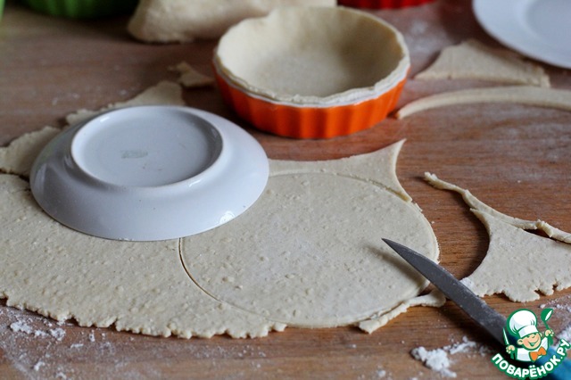 Теперь тесто. Достаём тесто с холода. Разрезаем на две части - для нижнего слоя возьмём чуть больше теста, т. к. у нас будут бортики. Раскатываем в тонкий пласт. Выстилаем дно формы.