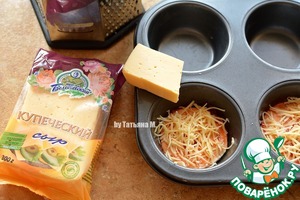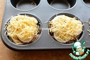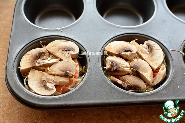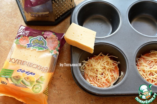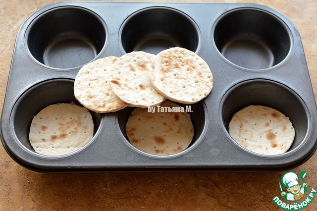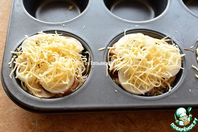 Из основы для пиццы подходящим стаканом вырезать кружки, диаметром формочек для кексов (по 2 кружка на каждую мини-пиццу);
