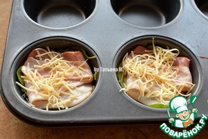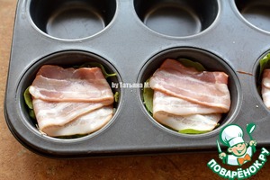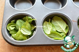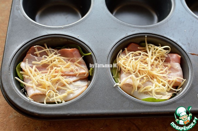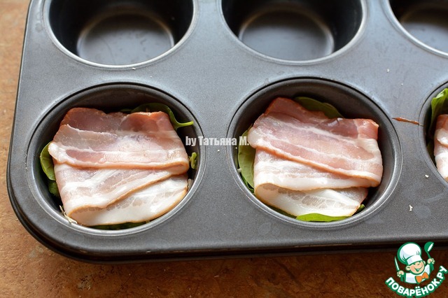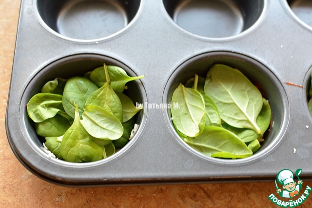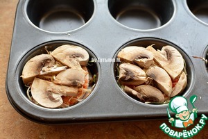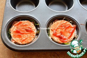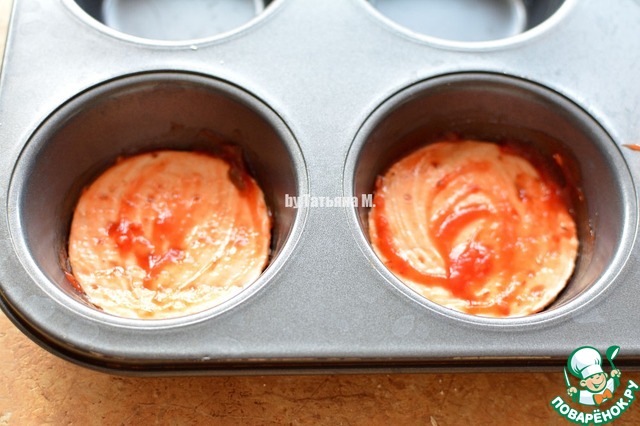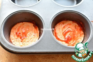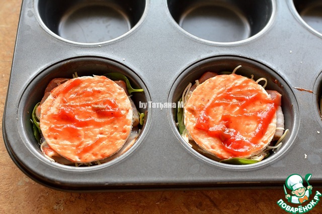 Вложить по 1 кружку в формы, смазать кетчупом;