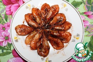 Креветки разморозить, добавить имбирь, порезанный соломкой, вино, перемешать и мариновать полчаса