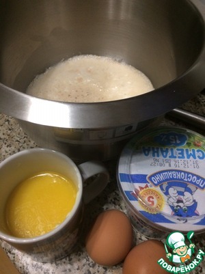 Через 10-15 минут, когда поднимется шапочка на опаре, добавить в чашу маргарин (растопленный, остуженный), 2 желтка, сметану, оставшийся сахар.