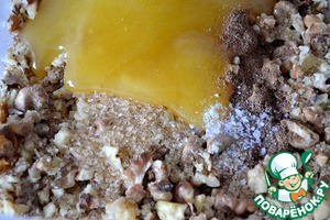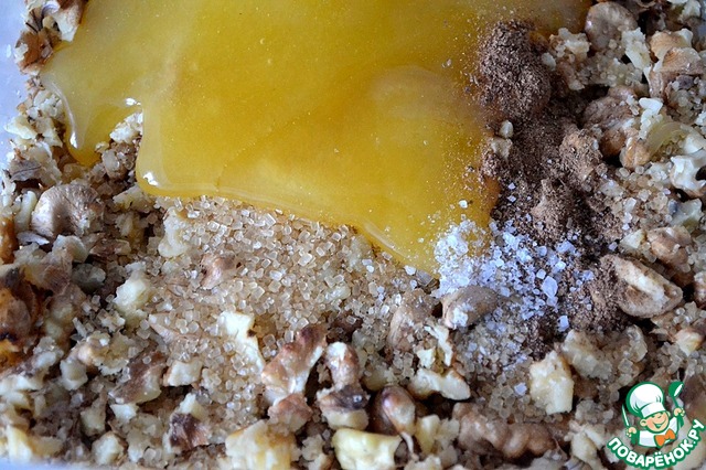 В орехи кладем мед, корицу, по вкусу - чуть-чуть соли и сахар.