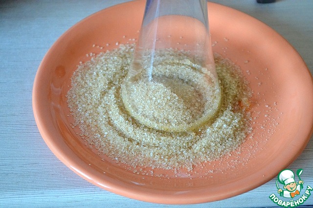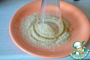 Окунаем бокал в воду и сразу же опускаем в сахар.