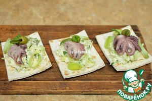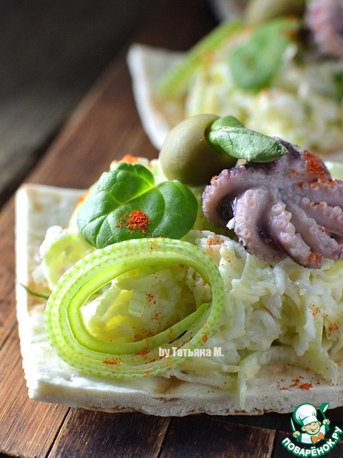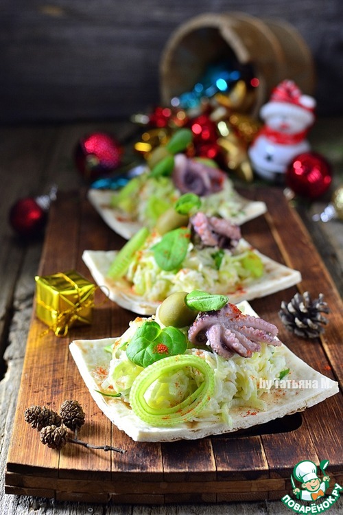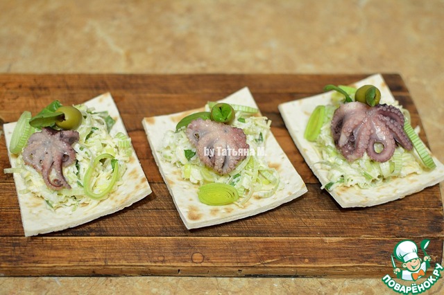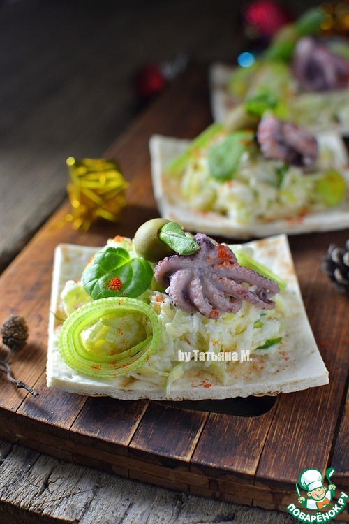 Выложить салат на лепешки, дополнить осьминожкой, оливкой и листьями шпината и лука, чуть присыпать перцем по желанию;