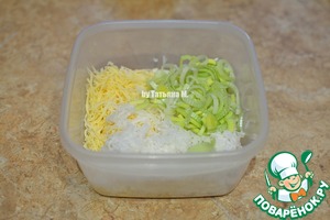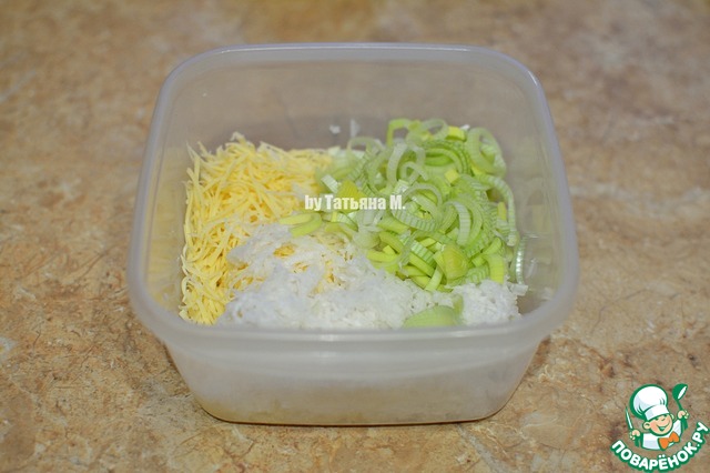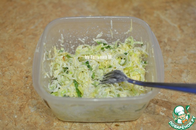 Добавить тертый дайкон, тонко резанный полукольцами - лук;