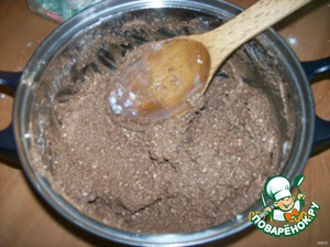 Халву порубить ножом или раскрошить руками. Творог растереть деревянной ложкой или пропустить через пресс для пюре, чтобы исчезли все комочки и крупинки. Соединить творог с халвой и растереть все до однородности, добавить какао. -