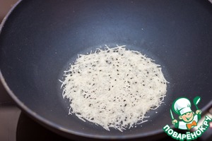 Разогрейте на среднем огне сухую сковороду с антипригарным покрытием, насыпьте тонкий слой тертого сыра, дождитесь, пока он сначала расплавится, а потом начнет подсыхать, переверните и подержите еще минутку-две. Снимите сырную лепешку и слегка изогните края, пока она еще горячая. Можно положить на смятый лист бумаги.