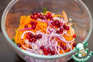 Когда креветки и фасоль остынут, добавьте к ним корейскую морковь, тонко нарезанный полукольцами красный лук и клюкву.