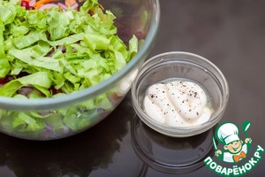 Нарежьте листья салата, добавьте их в миску. Смешайте майонез с лимонным соком и черным молотым перцем. Смешайте майонез с компонентами салата.