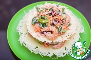 Снова лепешка, уже поменьше, и опять салат. И так три раза) Последний, верхний слой уже не стала фотографировать, думаю, и так все понятно)