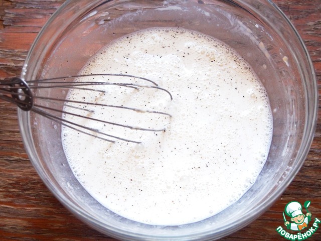 В сливки просеять муку, добавить соль, перец, хорошо перемешать, чтобы не было комочков. |