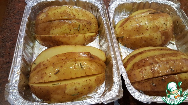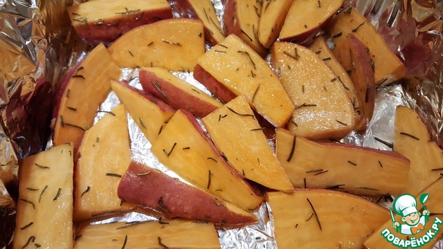 Картофель также тщательно вымыть, обсушить. Нарезать на дольки. Сложить в пакет, добавить Сладкий соевый соус, карри и растительное масло. Удобно использовать пакет от батата, немного розмарина добавит изюминки вкусу. Выложить картофель в форму для запекания и отправить в духовку. Запекать до готовности.