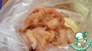 Итак, филе куриной грудки разрезать на несколько пластов, далее нарезать длинными полосками. Добавить соевый соус, я использовала Киккоман классический. -