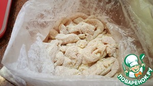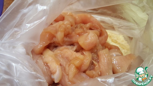 Таким образом не будет грязной посуды и куриные кусочки будут равномерно покрыты мукой.