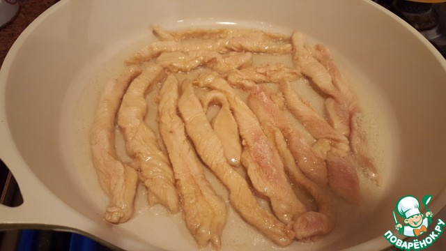 Обжарить куриные полоски в разогретом масле до готовности, буквально по минутке с каждой стороны.