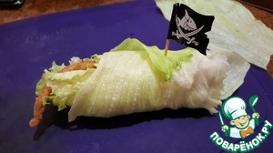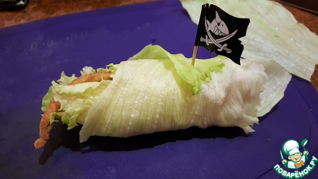 Айсберг или любой подходящий салат разделать на листы, разрезать лист на удобные кусочки. Положить два кусочка и завернуть в салат куриные змейки с бататом или с картофелем.