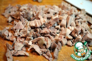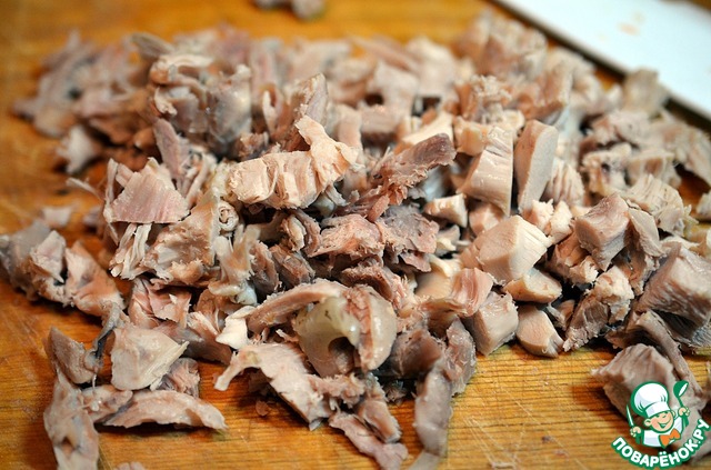 Крыло индейки отварить, отделить мясо и мелко нарезать. Крыло у индейки достаточно большое, из него можно сварить целую кастрюлю супа, но оно и относительно недорогое.