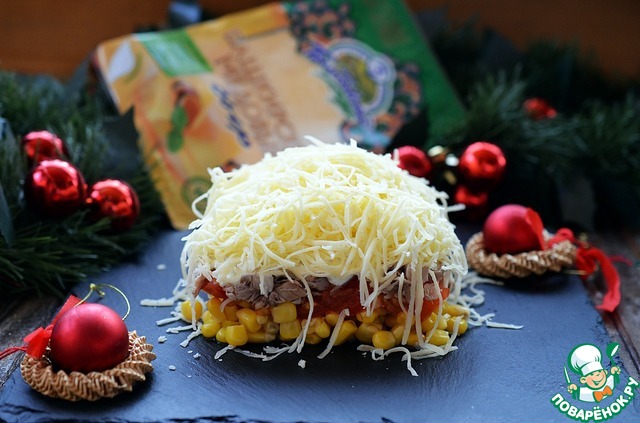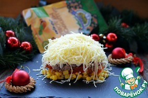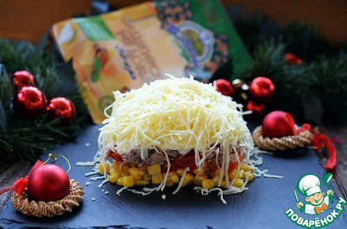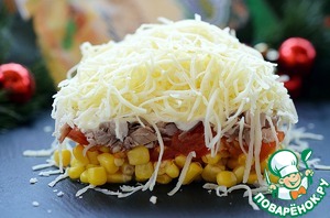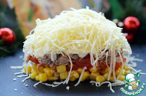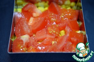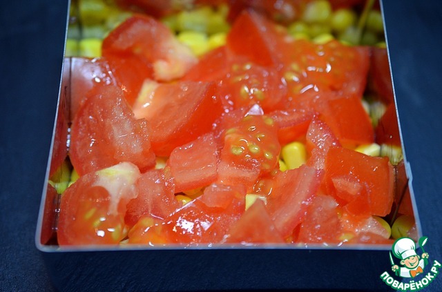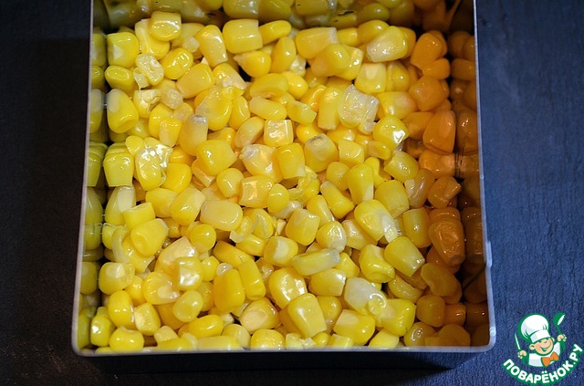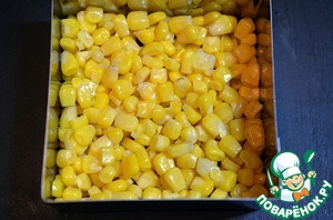 Выложить в формовочное кольцо (у меня квадрат) первым слоем кукурузу.