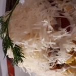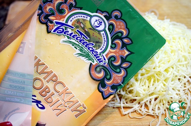 Сыр натереть (лучше всего натереть на терке для корейской моркови). Я для этого салата использую Башкирский медовый сыр Белебеевского Молочного комбината. Он обладает высокими вкусовыми качествами и не содержит растительных жиров.