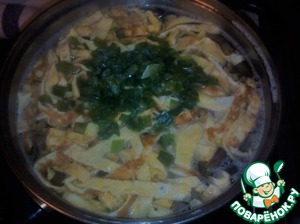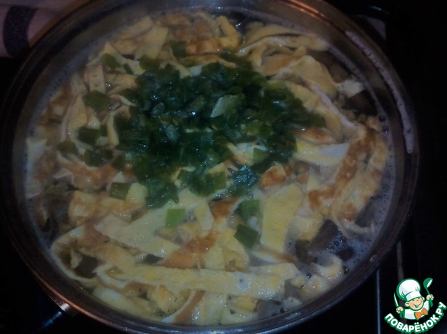 У нас уже вскипел бульон, доводим до готовности морковь и добавляем лапшу яичную, лук порезаный.
