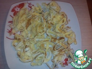 Пока закипает наш будущий суп, яйцо одно взбиваем, добавляем щепотку соли. Разогреваем сковороду, смазываем слегка подсолнечным маслом, выливаем яйцо и слегка придаем круглую форму. Накрыть крышкой. Жарится буквально минутку. Вытаскиваем наш блинчик и то же проделываем с другим яйцом.