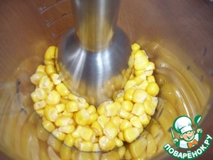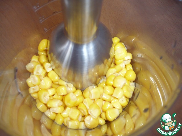 Консервированную кукурузу измельчить блендером до образования кукурузного пюре.