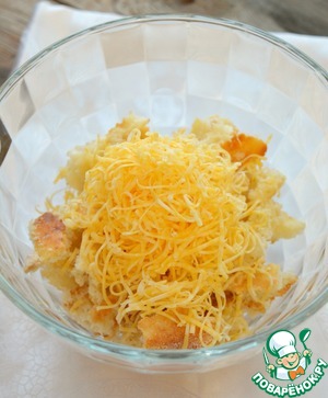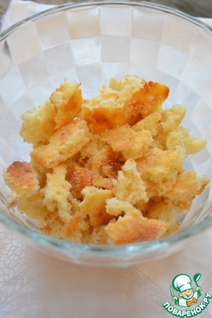К бисквиту добавьте натертый сыр, измельченный мандарин и ликер