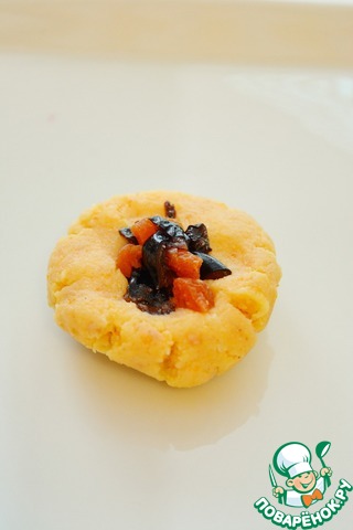 Из получившейся массы сформируйте лепешечку, в центр положите половину чайной ложки нарезанных сухофруктов (или цукаты)