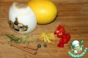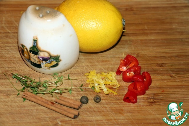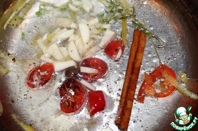 Растительное масло вылить в кастрюлю, положить туда острый перец, соль, душистый перец, черный перец, тимьян, корицу, чеснок - все прогреть, но не кипятить. Остудить.