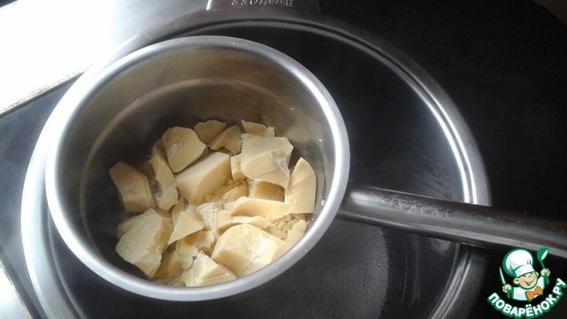 Какао-масло, помешивая, растопить на ПАРОВОЙ бане (важно, чтобы дно сотейника не касалось кипящей воды!)
