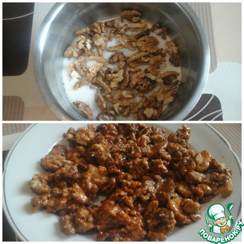 Толстостенный сотейник смазать растительным маслом без запаха, всыпать 100 г грецких орехов и 100 г сахара. Прогреть до растворения сахара и приобретения им коричневого цвета. Перелить орехи на смазанную маслом тарелку. -
