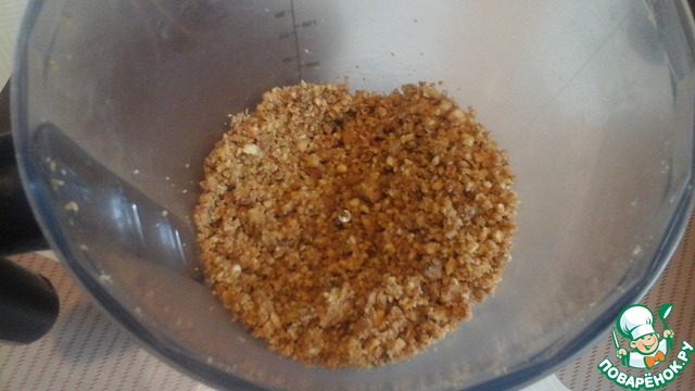 Орехи поломать на кусочки, перебить в блендере в мелкую крошку (нам больше нравится средняя крошка).