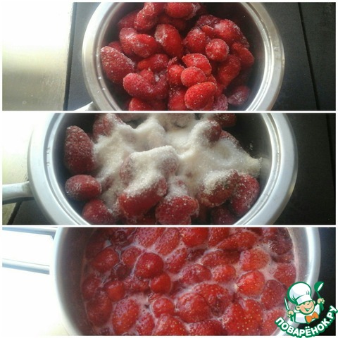 300 г замороженной клубники засыпать 70 г сахара, прогреть примерно до 60°. -