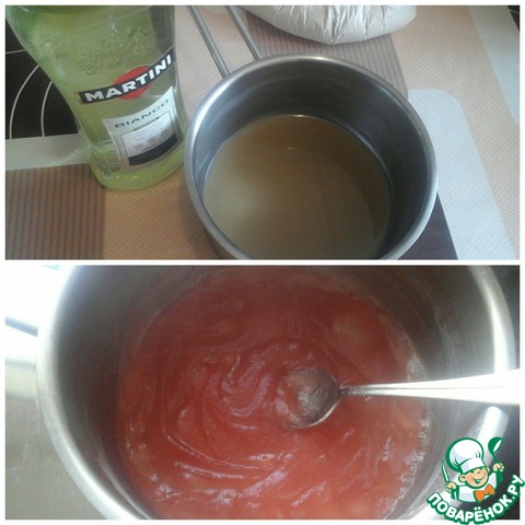 Отдельно в сотейнике 7 г агар-агара залить 50 мл мартини, добавить 2 столовые ложки клубничного сиропа. Прокипятить пару минут до растворения агара.