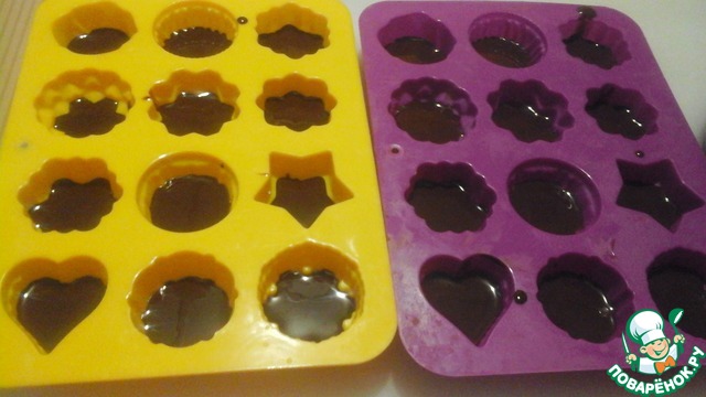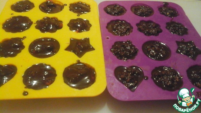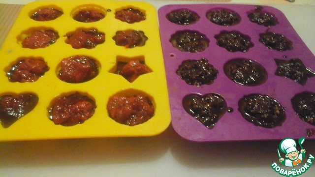 Начинку разложить по формам, слегка "втапливая" в шоколад. Слева у меня клубничная начинка, справа - пралине.