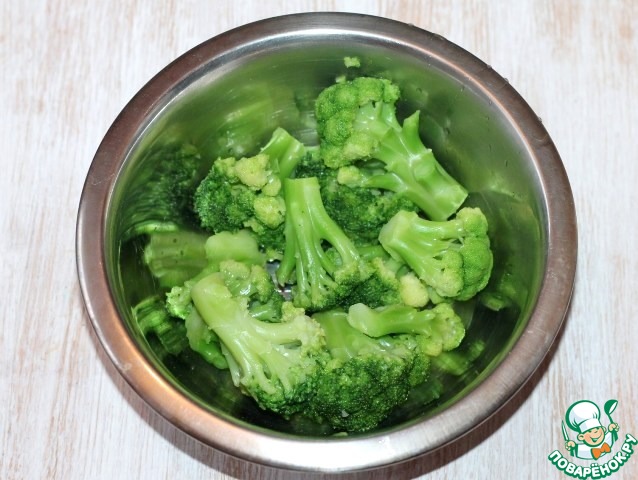 • 1. Приготовим котлетную массу. Разделяем брокколи на соцветия, отвариваем в подсоленной воде около 2 минут и откидываем на сито, чтобы стекла вода.