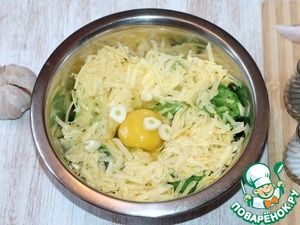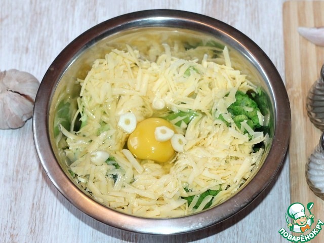 • 4. Добавляем брокколи, сыр, 1 яйцо, 1 дольку чеснока, солим, перчим...