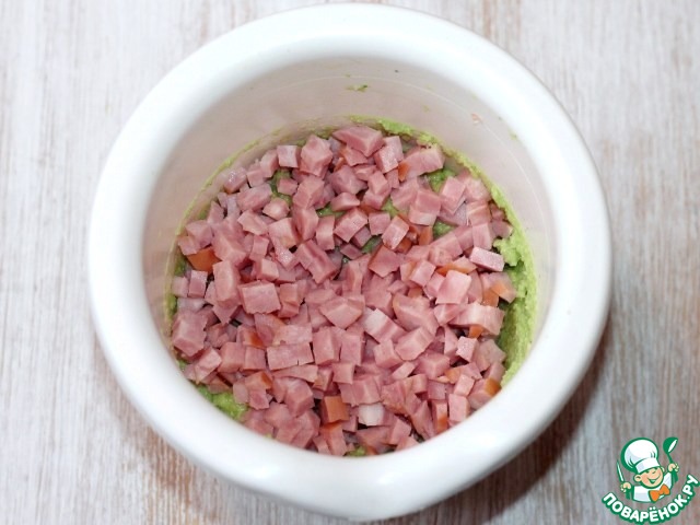 • 6. Мелко режем ветчину и смешиваем с брокколи. Отправляем массу в холодильник на 20 минут.