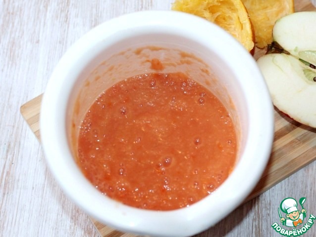 • 7. Приготовим соус. Очищаем от шкурки яблоко, удаляем семечки, нарезаем крупными дольками и отправляем в чашу блендера. Добавляем помидоры, перец и апельсиновый сок с измельченной мякотью.