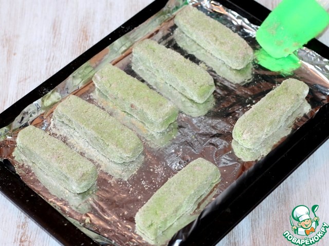 • 10. Разогреваем духовку до t 250 С. Из охлажденной массы лепим "котлетки" в форме прямоугольников или бочек, обваливаем в панировочных сухарях. Очень хорошо лепить прямоугольники при помощи силиконовой лопатки, а лучше двух.