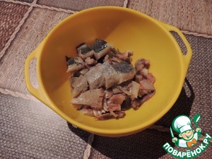 Начинаем с сельди. Лучше купить готовое филе, но мы же легких путей не ищем... есть же сельдь в морозилочке собственного приготовления... разморозила, почистила, осталось расчленить... и тут оказалось все не так уж и просто, потому что селедочка домашнего посола более упругая, отходить от косточек совсем не хотела. Поэтому красоты не вышло. Вот... режем на кусочки и складываем в мисочку, в которой будем мариновать