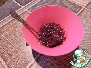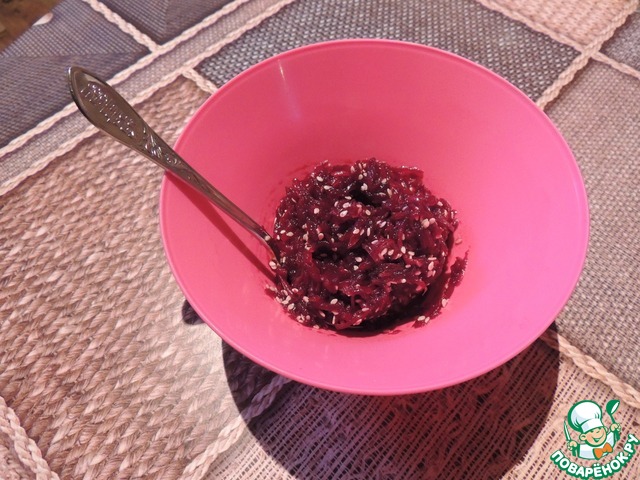 На этом подготовительный этап окончен. Ждем пока замаринуется селедка. Все остальное делаем перед подачей блюда. Делаем маринад для свеклы. 1 ч. л. оливкого масла, 1 ч. л. соевого соуса kikkoman, 1 ч. л. кунжута и половина ч. л. лимонного сока, смешиваем. Добавляем свеклу натертую на мелкую терку, перемешиваем.