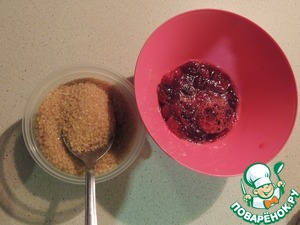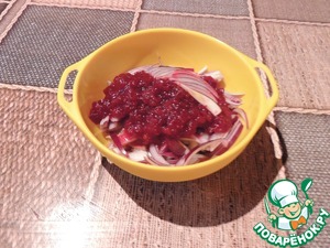 Делаем маринад. Берем клюкву, у меня мороженая 50-80 гр., давим, чтобы пустила сок
