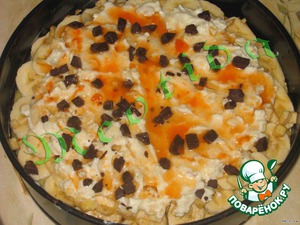 • Шоколад нужно крупно порубить ножом и положить на верх пирога, поливаем равномерно абрикосовым соком (можно взять любой другой, но желательно натуральный и с приятной кислинкой).