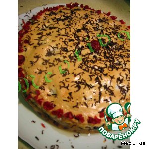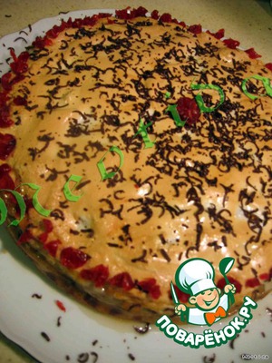 • Готовый пирог вынимаем из формы (желательно дать ему в этой самой форме остыть, чтобы было легче вынимать), посыпаем тертым шоколадом и измельченной сушеной вишней (можно украсить иначе..все зависит от Вашего вкуса и желания..мне было некогда заниматься особым украшательством, поэтому я посыпала шоколадом и вишней)...
