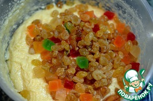 В масляно-яичную смесь добавьте изюм и цукаты, предварительно замоченные в горячей воде.