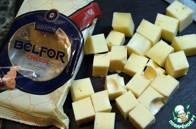 Сыр нарезать кубиками где-то 1см на 1 см. Я использую сыр "Бельфор" Белебеевского Молочного комбината. Он очень подходит для маринования, так как и сам по себе обладает сладковато-ореховым вкусом. Кроме того, он сделан из натурального молока без добавления растительных жиров.