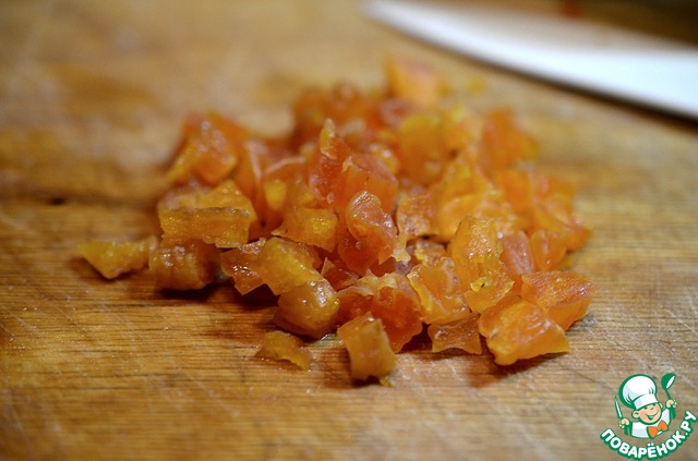 Залейте курагу кипятком на 10 минут, затем мелко нарежьте.