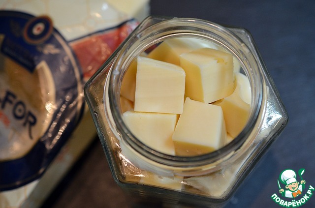 Кубики сыра выложите в баночку.