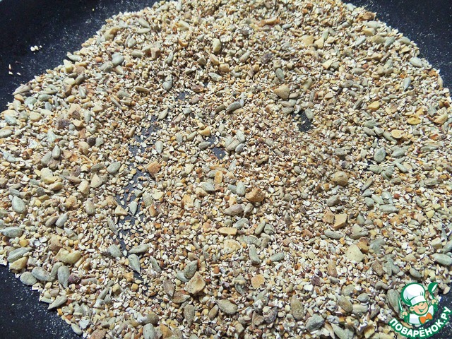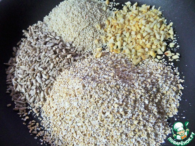 Отруби (или овсянку) с орехами и семечками насыпать на сухую сковороду.